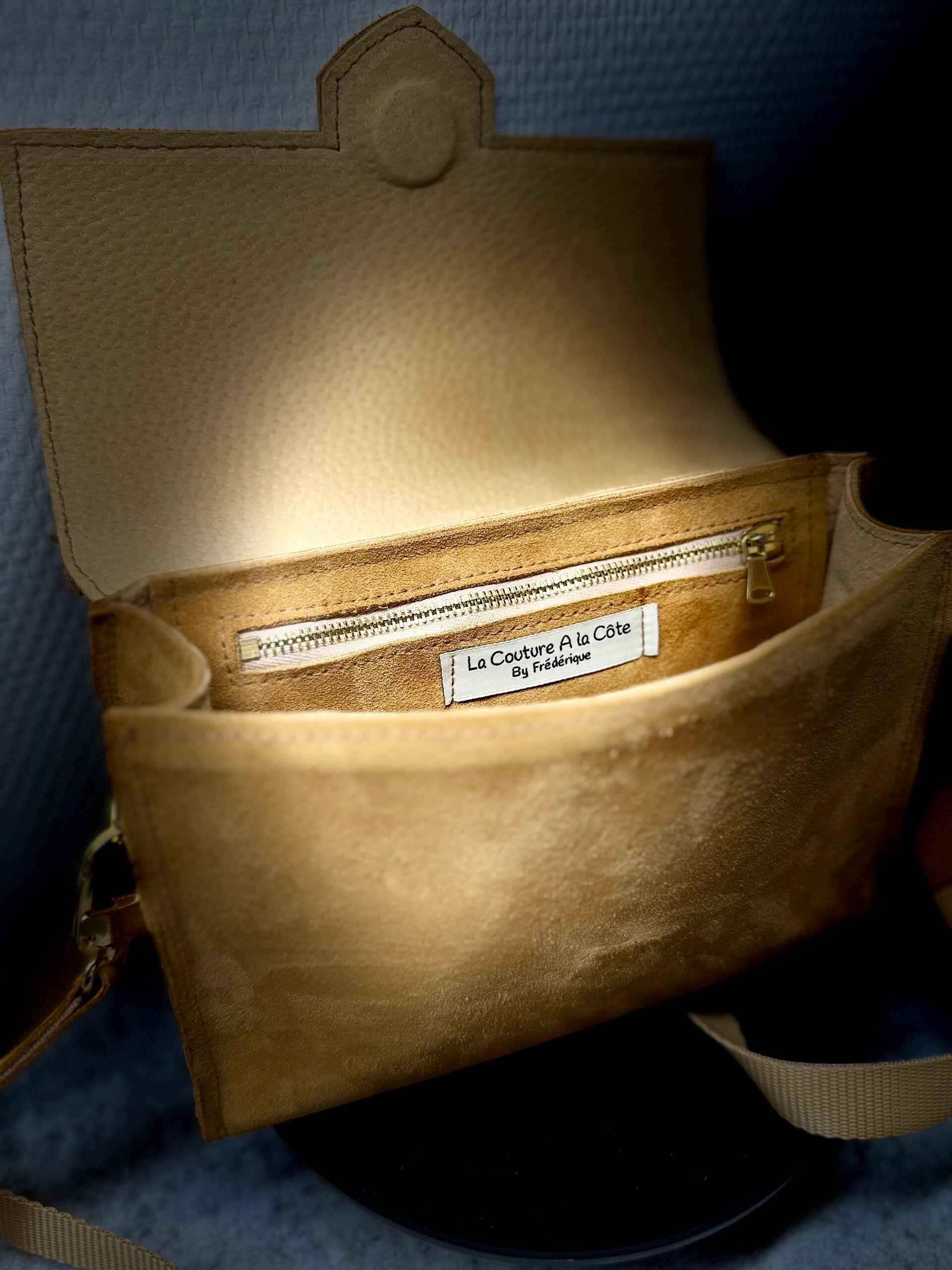 Sac Roma confectionné dans une croûte de cuir Jaune Curry. Se porte en bandoulière ou à la main. Couture à la machine.