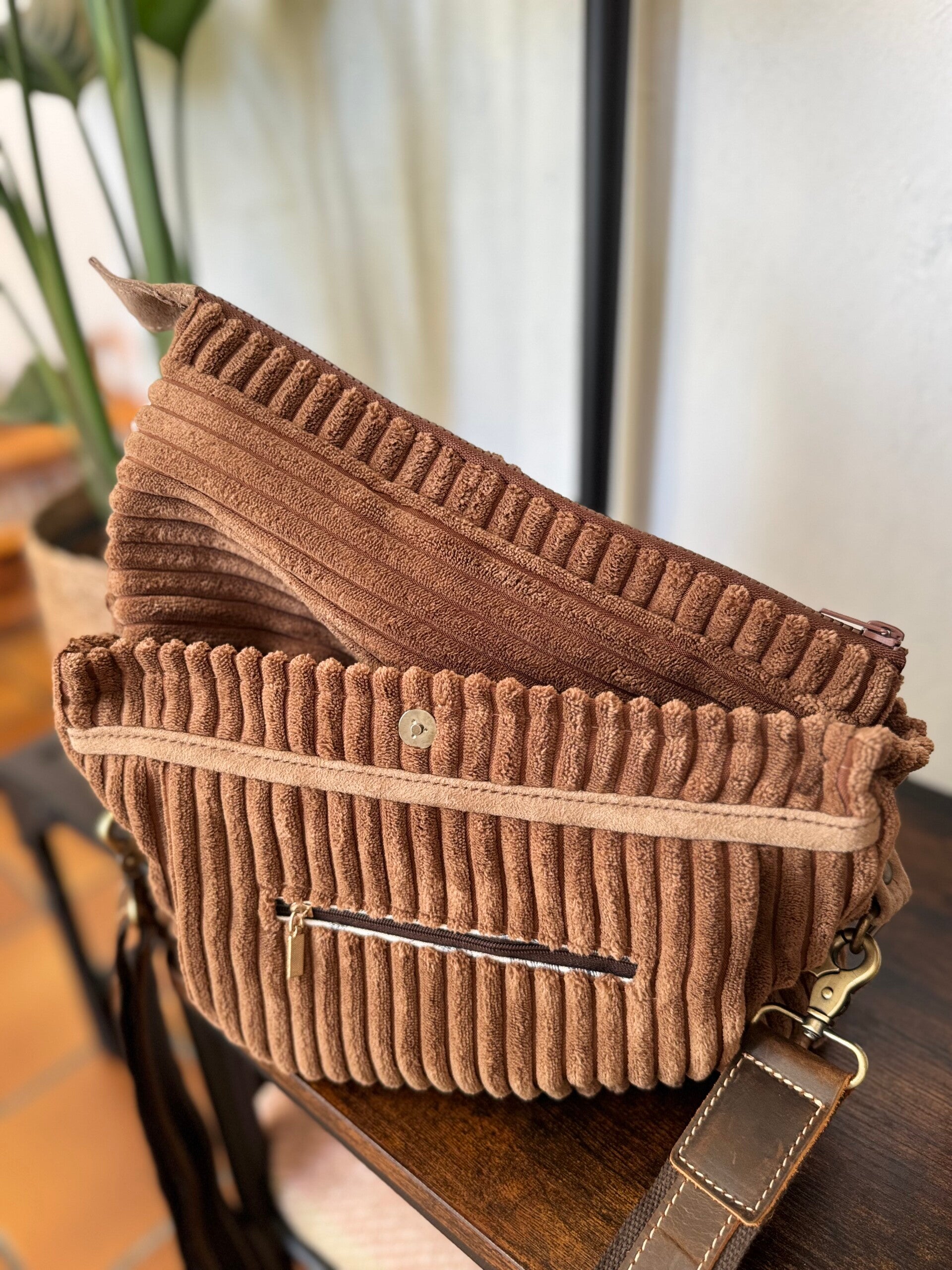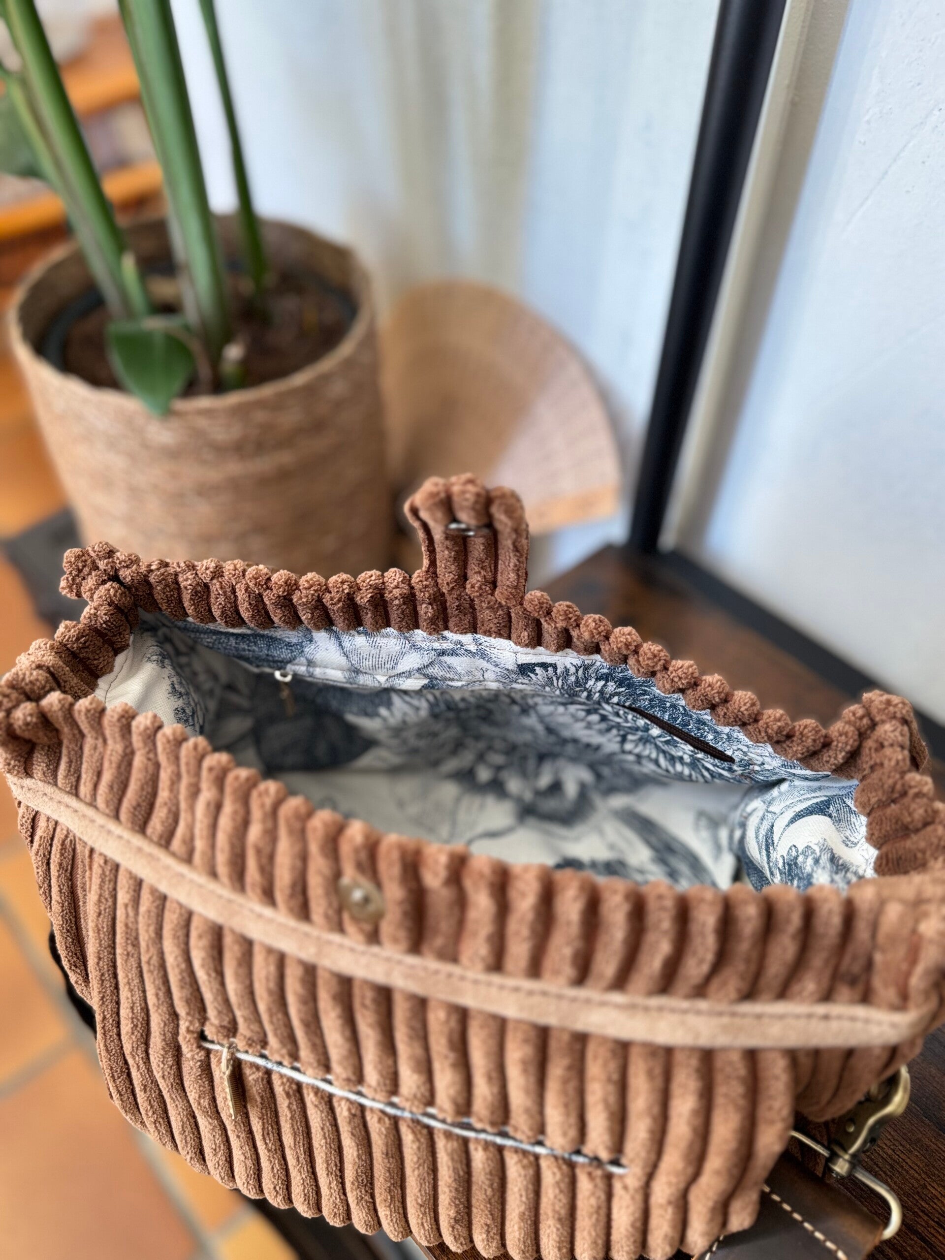 Sac en velours marron grosses côtes, doublure en une toile de jouy bleu compartimentée en poches et poche zippée. Poche zippée extérieur. Pochette zippée intérieur amovible. Bandoulière sangle & cuir.